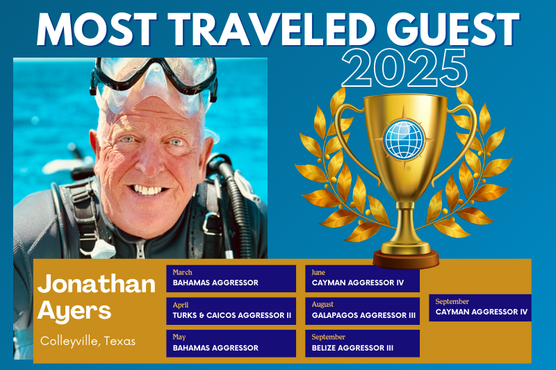As a special thank you from Aggressor, Mr. Ayers will receive a $1,000 travel voucher, a $150 Aggressor Boutique credit, and a Most Traveled Guest of 2025 Plaque. We look forward to seeing you on another adventure soon. Read the full blog here.